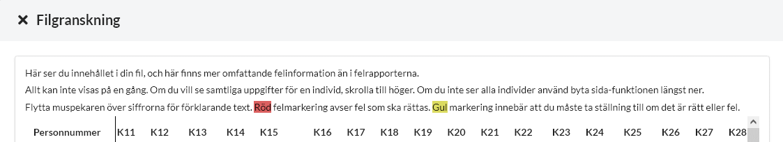 - Klickar man på filen så får man upp alla rader och kolumner, rutor som är markerade med rött eller gult innehåller fel respektive frågetecken. Dessa behöver redas ut.